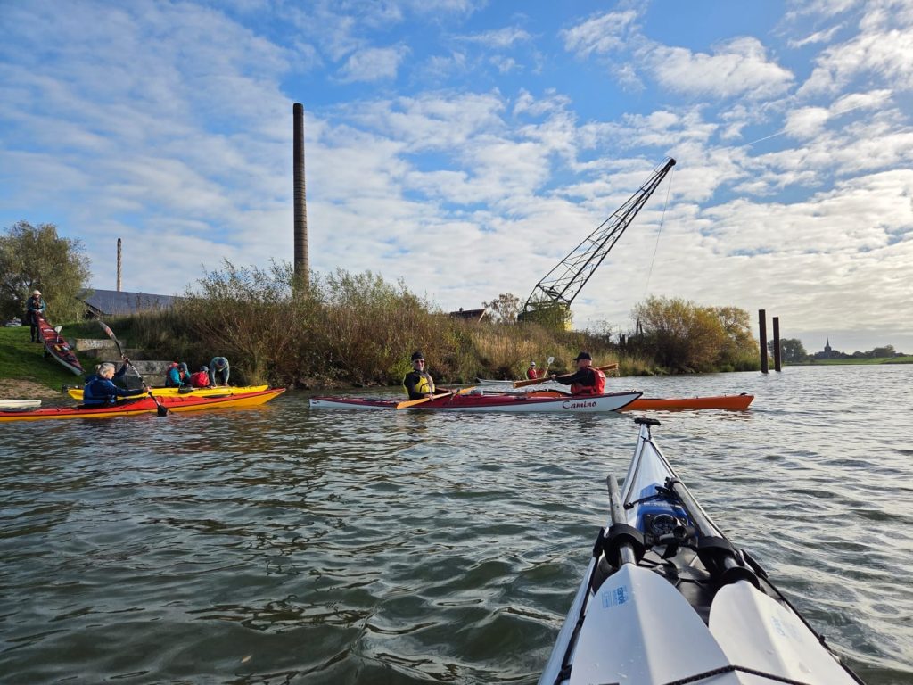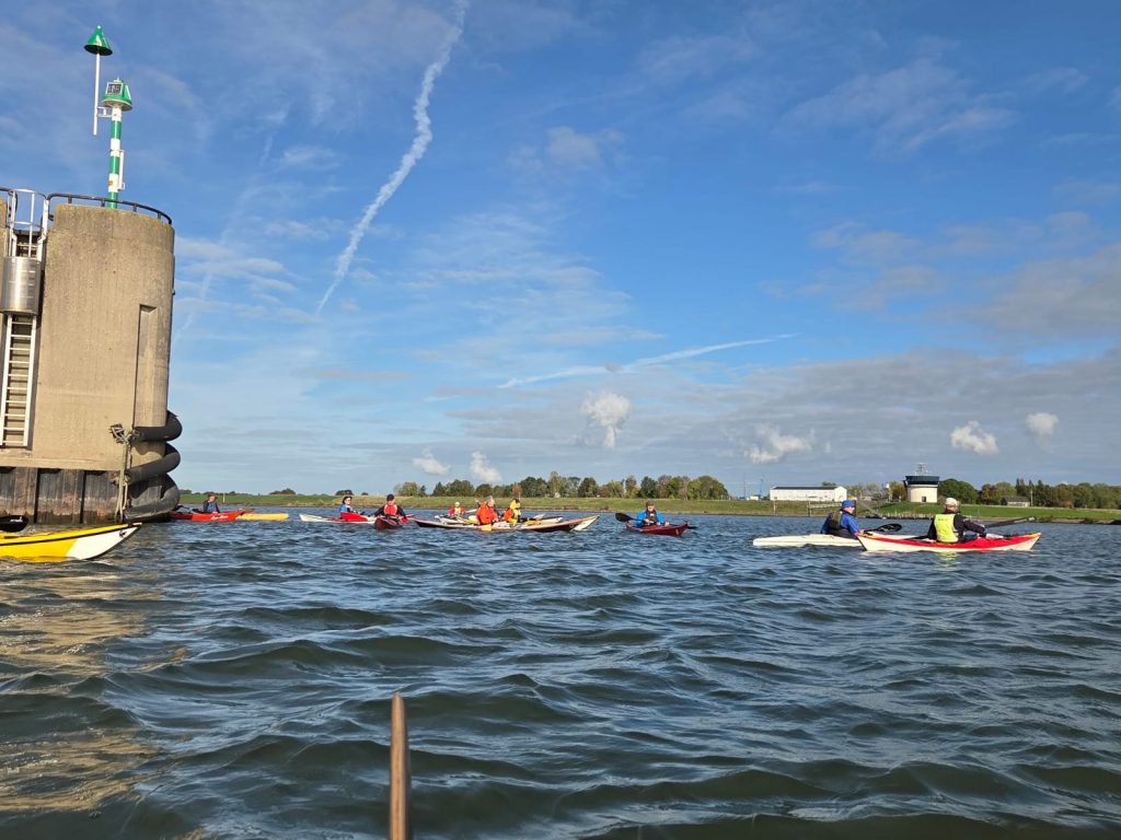 Er waren een voor- en achtervaarder georganiseerd en we schreven allemaal onze namen, telefoonnummers en noodtelefoonnummers op. Veiligheid boven alles! Ruud vertelde ons de regels bij het passeren van het Amsterdam Rijn Kanaal. Hij gaf aan dat we aangemeld waren bij de politie en waar we moesten wachten tot schepen voorbij waren. In de “oksels” van de kruising waren plaatsen aangelegd waar vuil zich kon verzamelen en wij stromingsvrij en rustig konden wachten. Natuurlijk heeft de Lek laag en hoog water op gezette tijden. De club heeft daarom een veilige helling en een vlonder om de boten te water te laten.